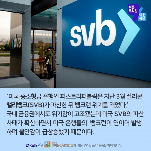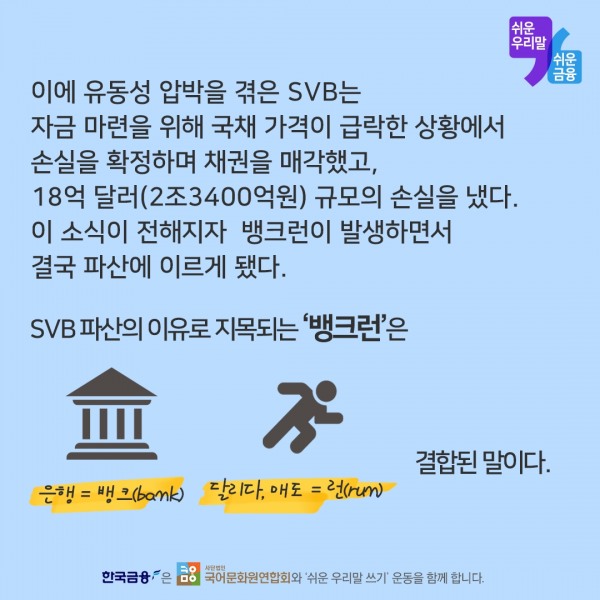 SVB 파산의 이유로 지목되는 ‘뱅크런’은 은행 = 뱅크(bank) / 달리다,매도 = 런(run) 결합된 말이다.