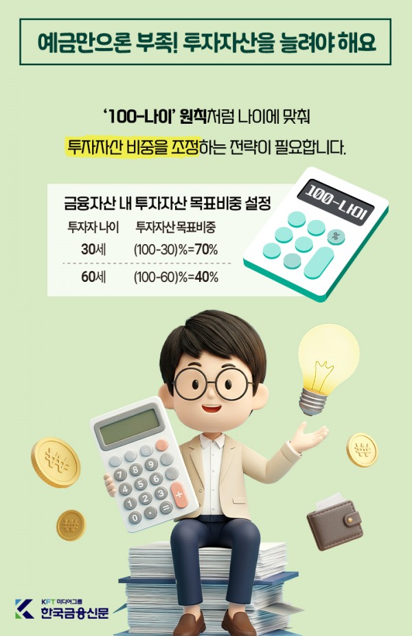 원금 보장 상품만으로는 물가 상승을 이기기 어렵습니다.‘100-나이’ 원칙처럼 나이에 맞춰 투자자산 비중을 조정하는 전략이 필요합니다.