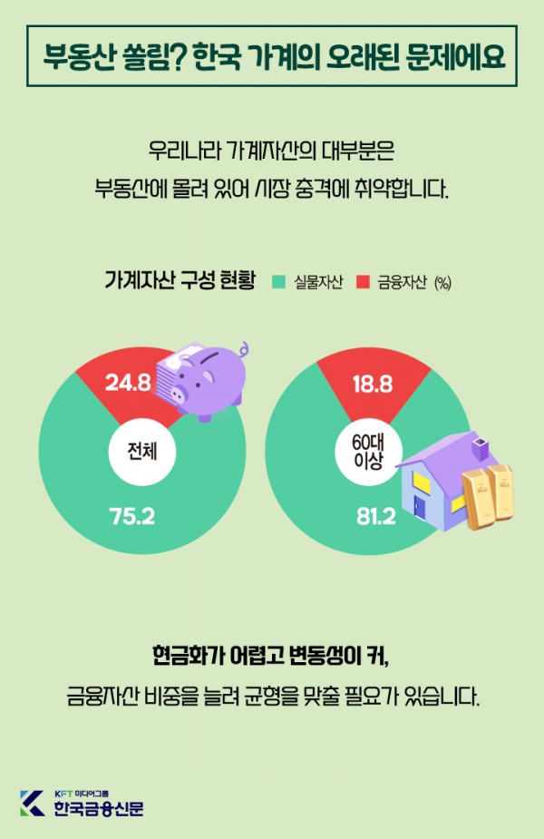 우리나라 가계자산의 대부분은 부동산에 몰려 있어 시장 충격에 취약합니다.현금화가 어렵고 변동성이 커, 금융자산 비중을 늘려 균형을 맞출 필요가 있습니다.