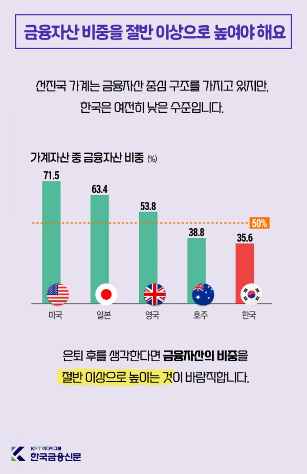 선진국 가계는 금융자산 중심 구조를 가지고 있지만, 한국은 여전히 낮은 수준입니다.은퇴 후를 생각한다면 금융자산의 비중을 절반 이상으로 높이는 것이 바람직합니다.
