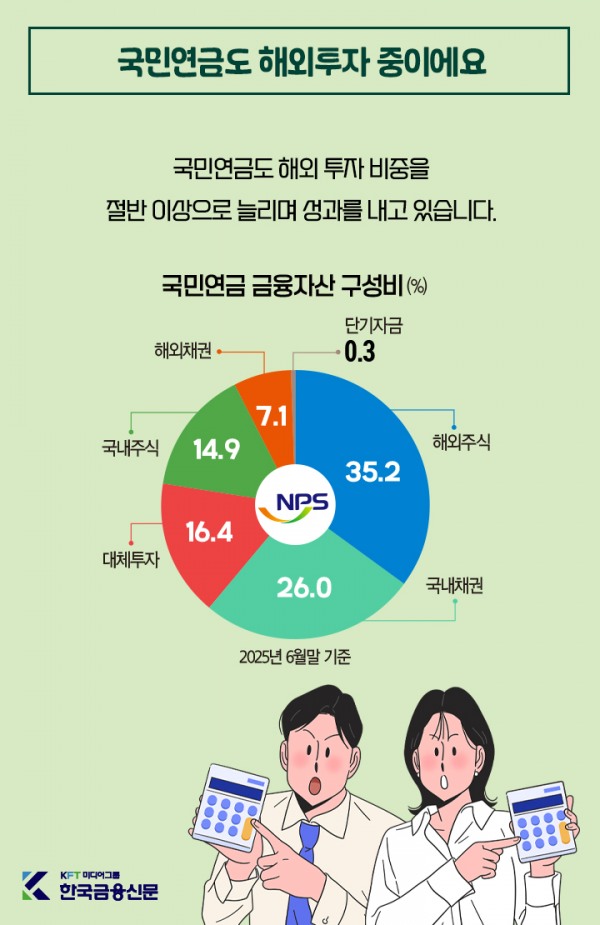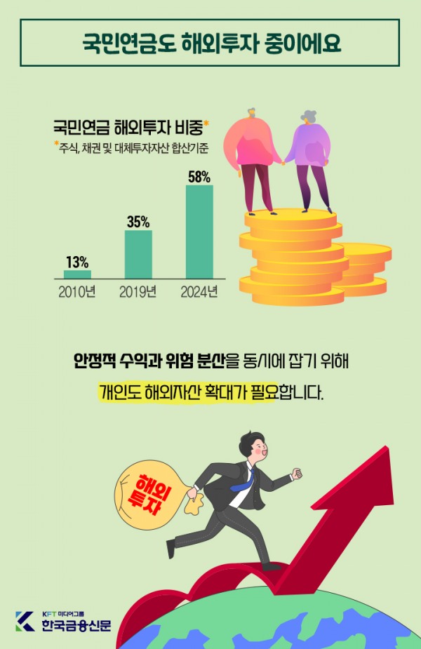 국민연금도 해외 투자 비중을 절반 이상으로 늘리며 성과를 내고 있습니다.안정적 수익과 위험 분산을 동시에 잡기 위해 개인도 해외자산 확대가 필요합니다.