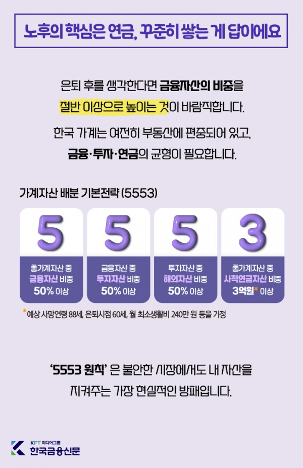국민연금만으로는 은퇴 생활비를 충족하기 어려워 사적연금이 필수입니다.은퇴 후를 생각한다면 금융자산의 비중을 절반 이상으로 높이는 것이 바람직합니다.