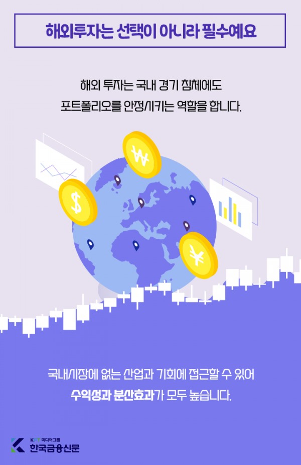해외 투자는 국내 경기 침체에도 포트폴리오를 안정시키는 역할을 합니다.국내시장에 없는 산업과 기회에 접근할 수 있어 수익성과 분산효과가 모두 높습니다.